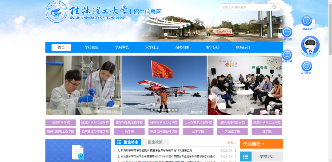 招生动态、查询历年分数、招生政策、报考指南、学校要闻、招生分类......招生资讯一应俱全,招生各项信息权威发布就在桂林理工大学招生网。