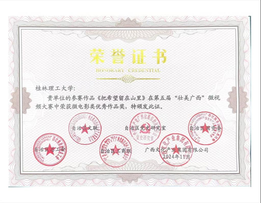 近日,由自治区文联、自治区党史研究室、自治区国资委、自治区总工会、自治区工商联、广西文化产业集团有限公司等六单位共同举办的第五届“壮美广西”微视频大赛获奖名单揭晓。我校商学院辅导员于帅帅团队原创的微视频作品《把希望留在山里》荣获微电影类“优秀作品奖”;南宁分校教师万纹天团队原创的微视频作品《麓鸣》荣获短视频类“优秀作品奖”。