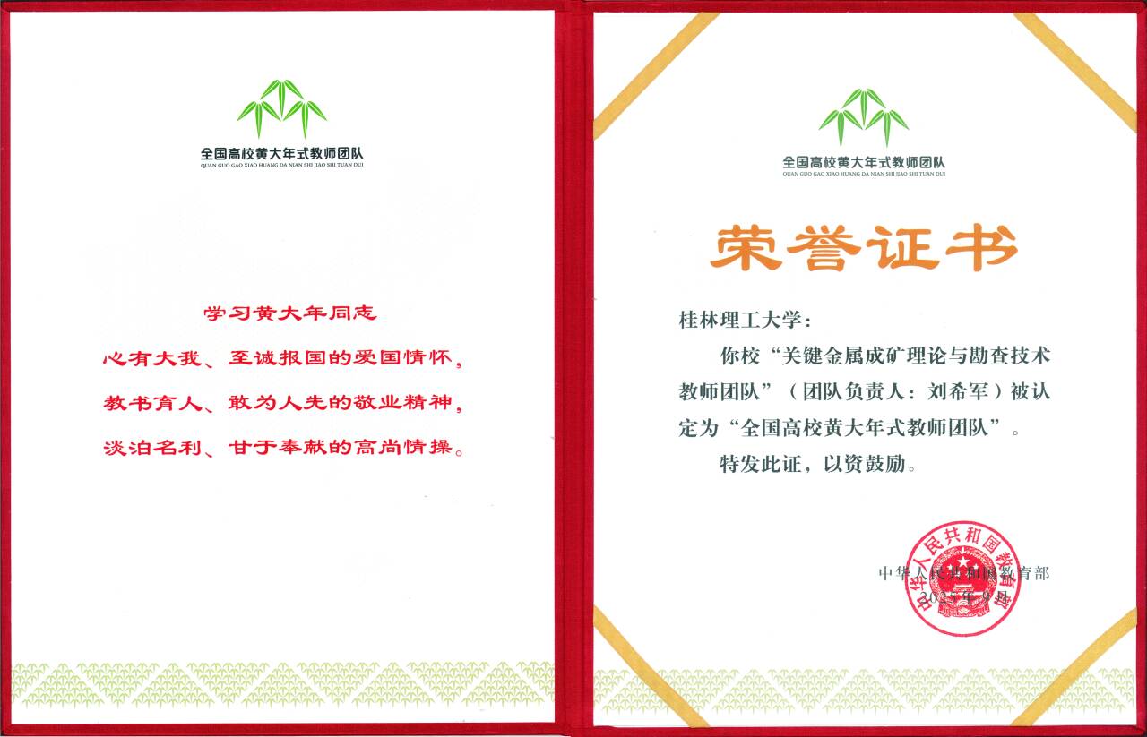 近日,教育部正式颁发 “全国高校黄大年式教师团队” 认定证书。我校“关键金属成矿理论与勘查技术教师团队”(团队负责人:刘希军)成功入选并获此殊荣,实现了我校在该国家级荣誉领域 “零的突破”。