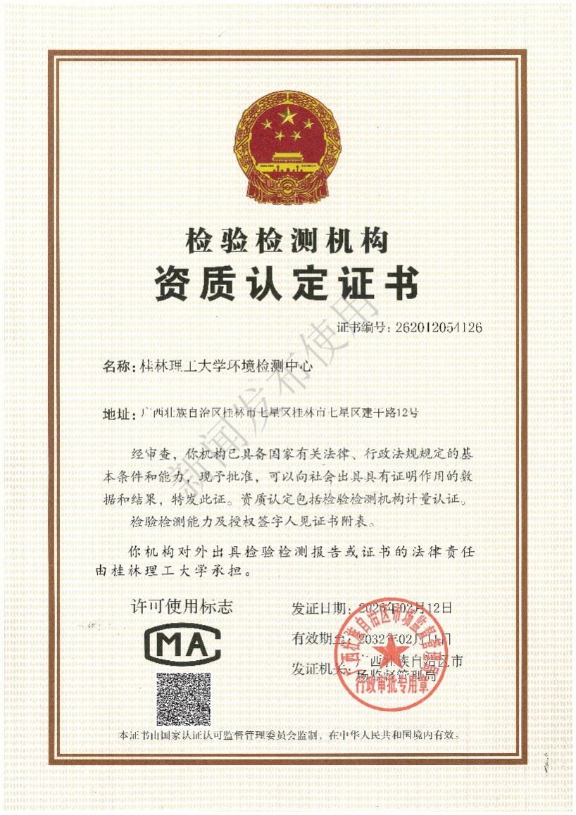 其中,桂林理工大学环境检测中心成功获得检验检测机构资质认定(CMA认证),业务范围涵盖水(含大气降水)和废水、土壤与沉积物两大类别的41项检测指标。该资质的获批,标志着中心的检测能力、管理水平已达到国家认可标准,可依法开展第三方检验检测服务,为环境监测、污染治理等工作提供科学、准确、权威的检测数据支撑。