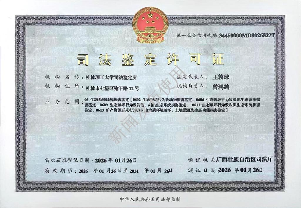 桂林理工大学司法鉴定所同步取得司法鉴定许可证,16名核心成员均顺利获得生态环境损害鉴定执业资格,执业范围涵盖五大核心领域,包括生态破坏行为致动物损害鉴定,生态破坏行为致湿地生态系统损害鉴定,生态破坏行为致河流、湖泊生态系统损害鉴定,生态破坏行为致农田生态系统损害鉴定,矿产资源开采行为致矿山地质环境破坏、土地损毁及生态功能损害鉴定。这一资质的落地,填补了我校在生态环境损害司法鉴定领域的空白,为生态环境司法公正、生态保护修复提供了专业技术保障。